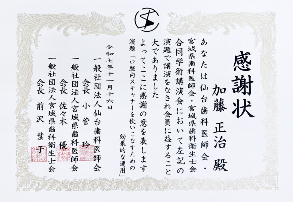 2025年11月16日,仙台歯科医師会,宮城県歯科医師会,宮城県歯科衛生士会主催,合同学術講演会に加藤院長が登壇し,感謝状を授与されました.